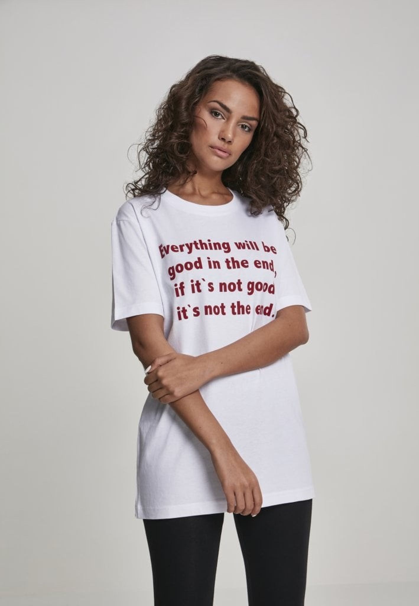 En hvid t-shirt med et positivt tryk, der vil trøste os, når vi har svært ved det.