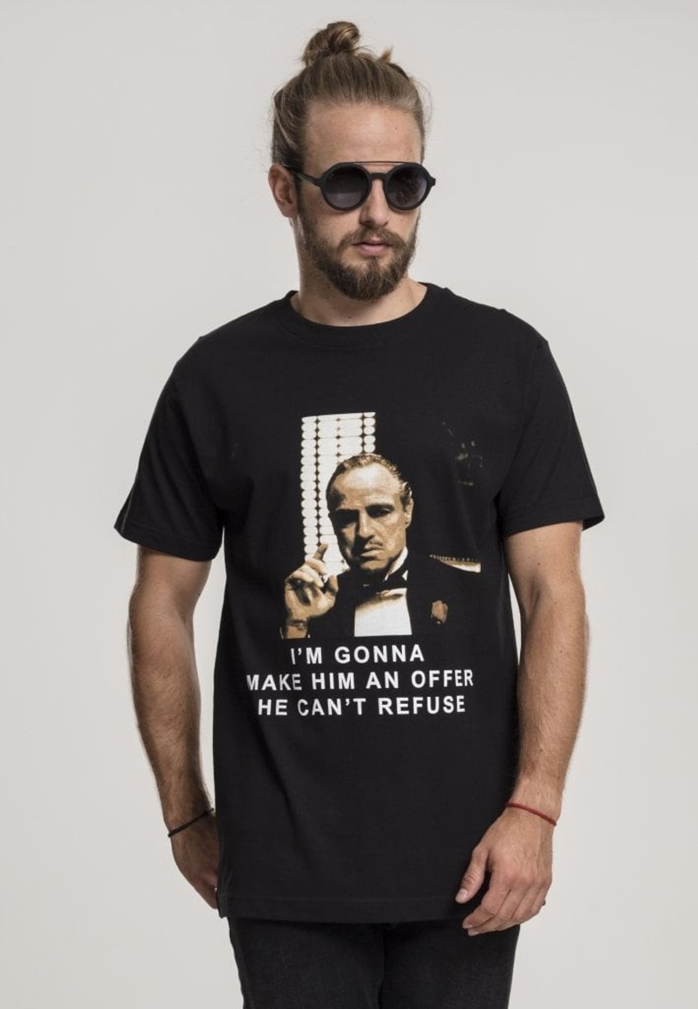 En sort t-shirt med den seje gudfader og et ironisk print "I'M GONNA GØR HAN ET TILBUD, DER KAN IKKE REFUSE". Udskriften er på forsiden.