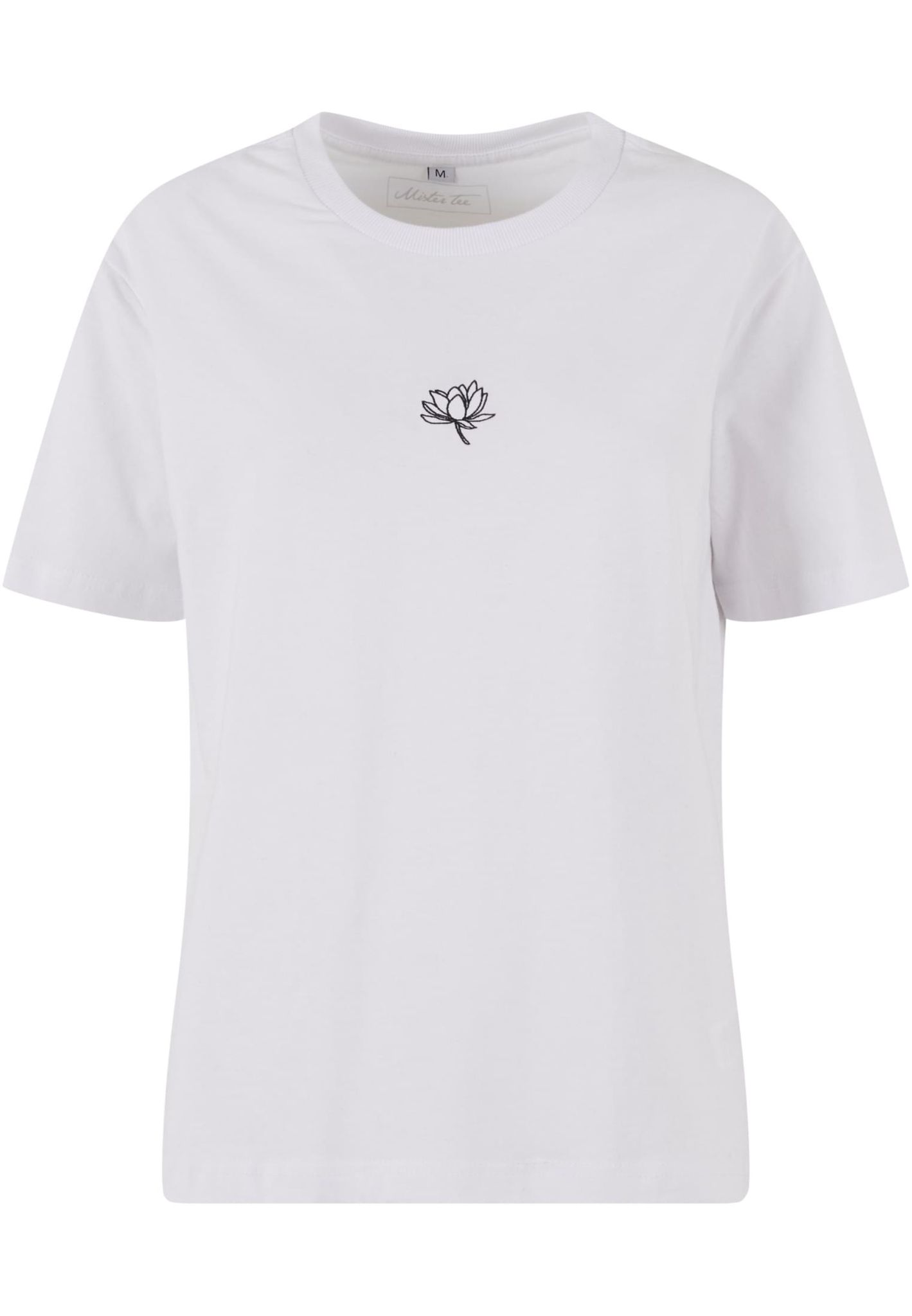 En vit T-shirt med en stilren blomma broderad på bröstet