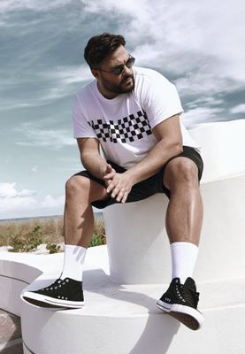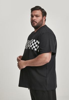 En stilfuld T-shirt med en rem over brystet, der minder om checkerboard eller et målflag.