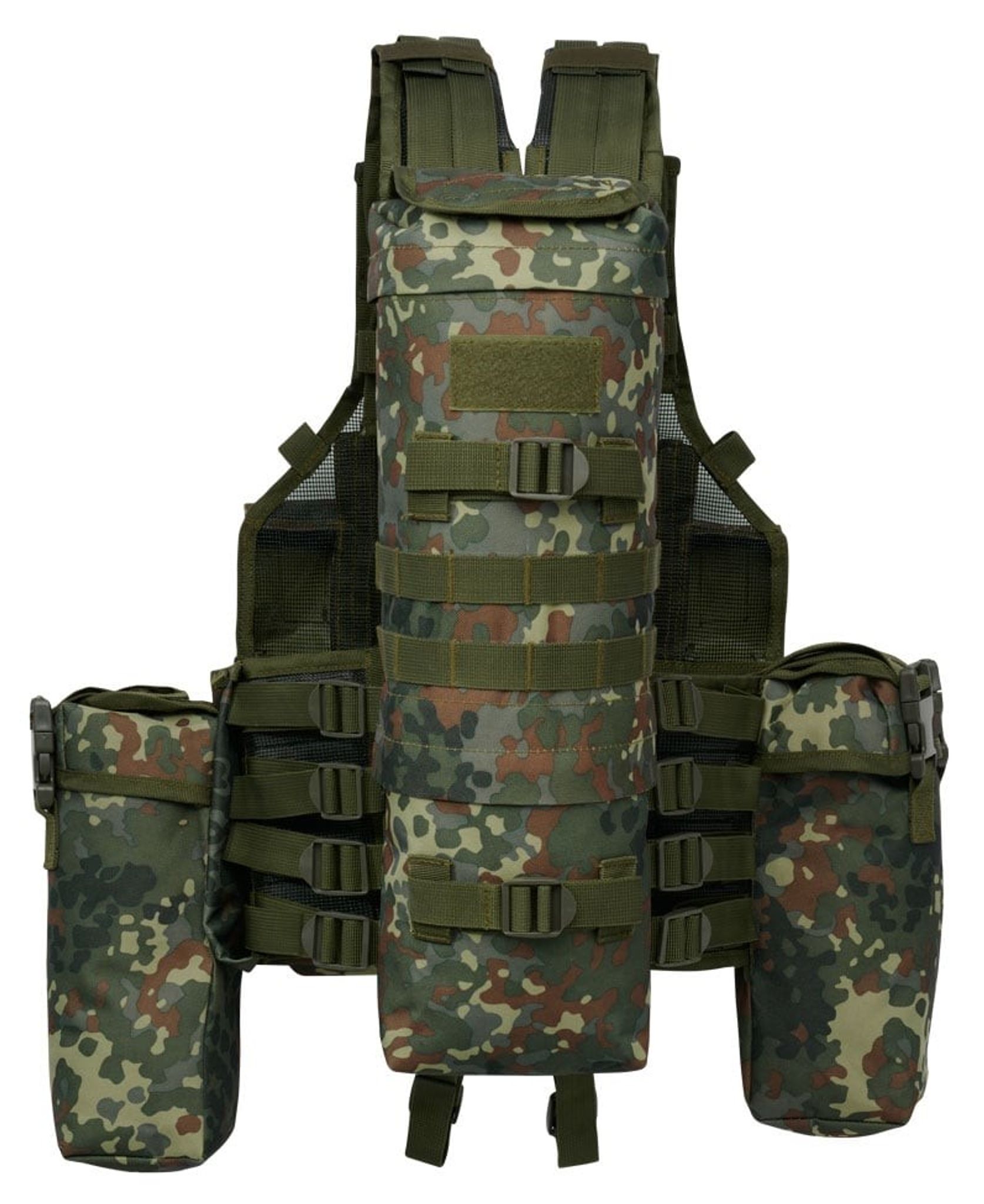 En funktionel vest, der er udstyret med masser af praktiske beholdere, lommer og fastgørelsesløkker. Denne vest er udstyret med udstyr i den tyske Flecktarn -camouflage.