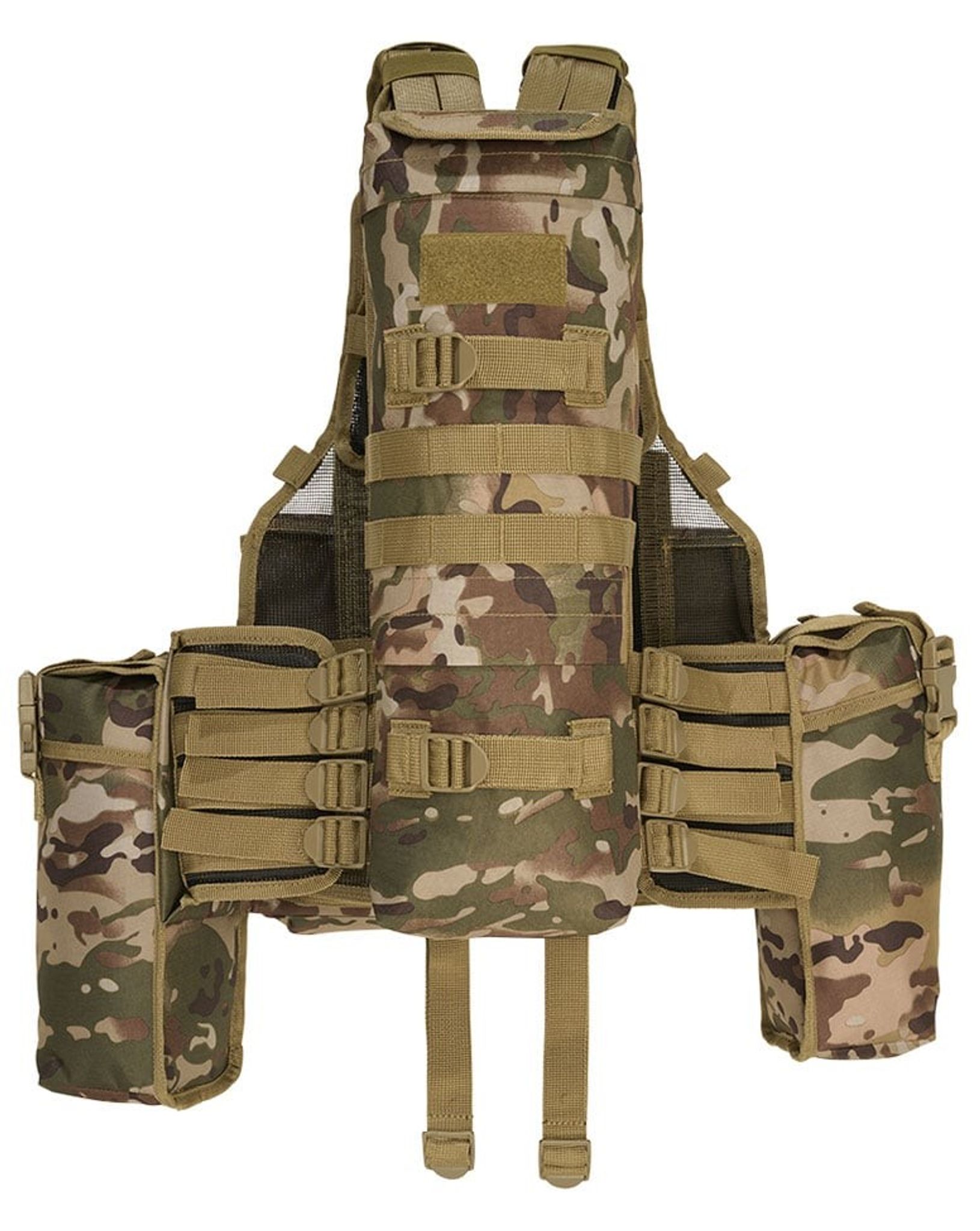 En veludviklet og praktisk multi-modul vest, der gør udvalgt grej nemt at bære, samtidig med at det er let tilgængeligt. Vesten er lavet af taktisk camo-mønstret polyesterstof med polyurethanbetræk.