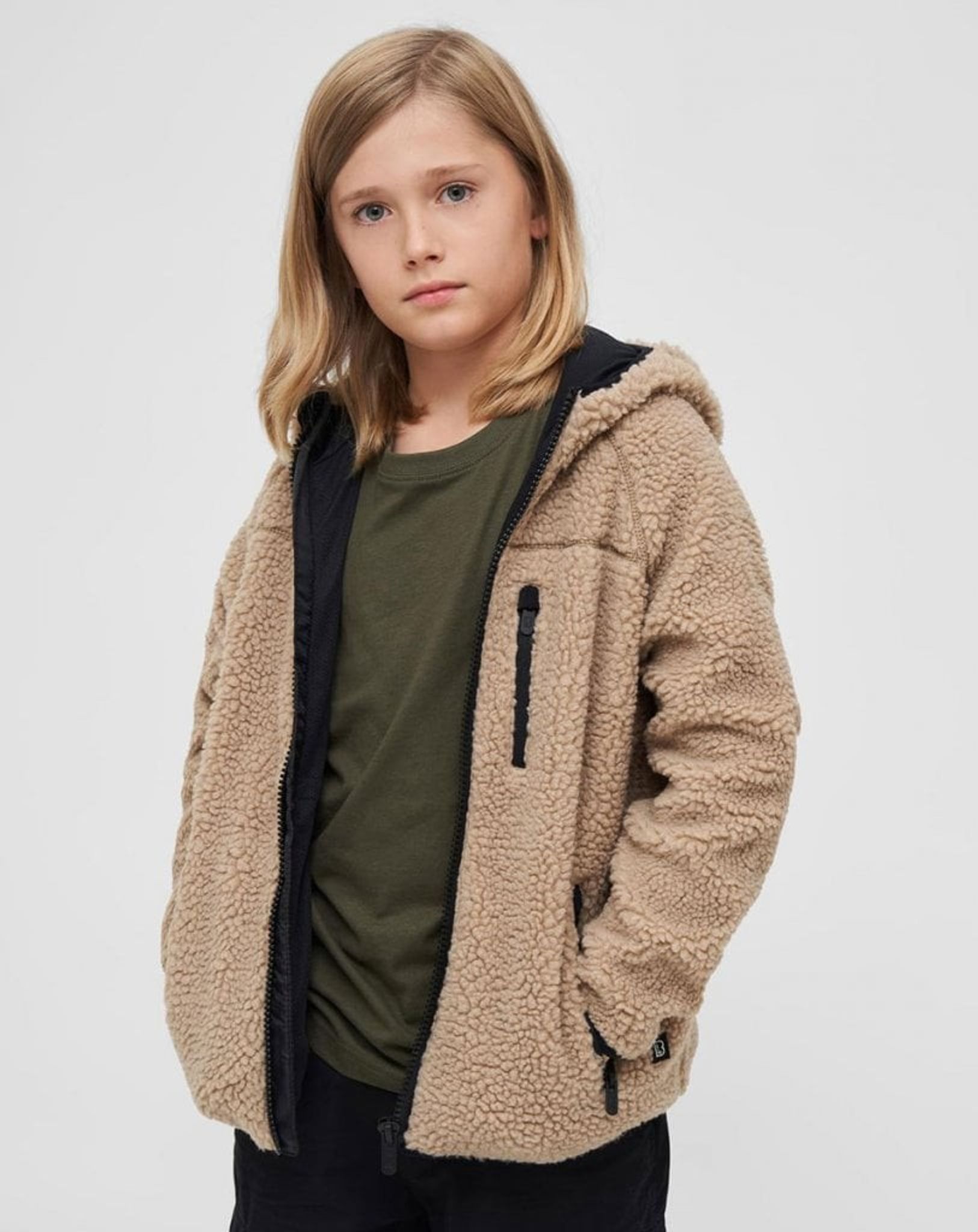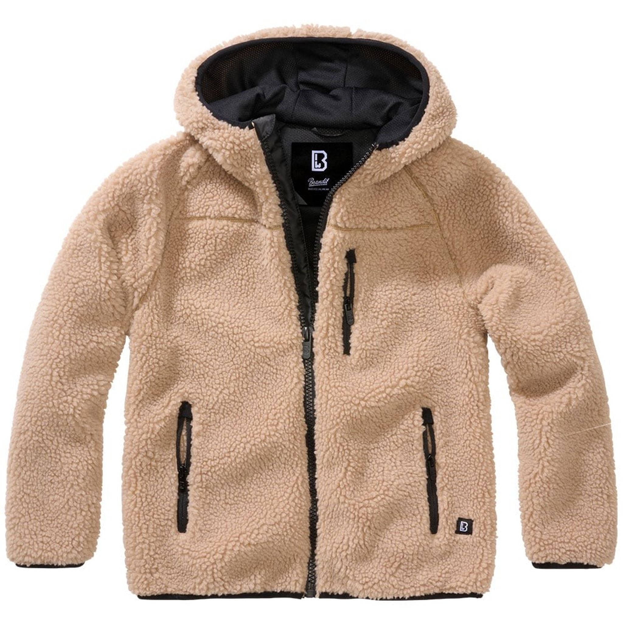 En lys beige teddy jakke i hyggelig og varm teddy fleece. Jakken åbnes og lukkes med en lynlås, der kan trækkes helt op over hagen. Lynlåsen har også en stormklap.