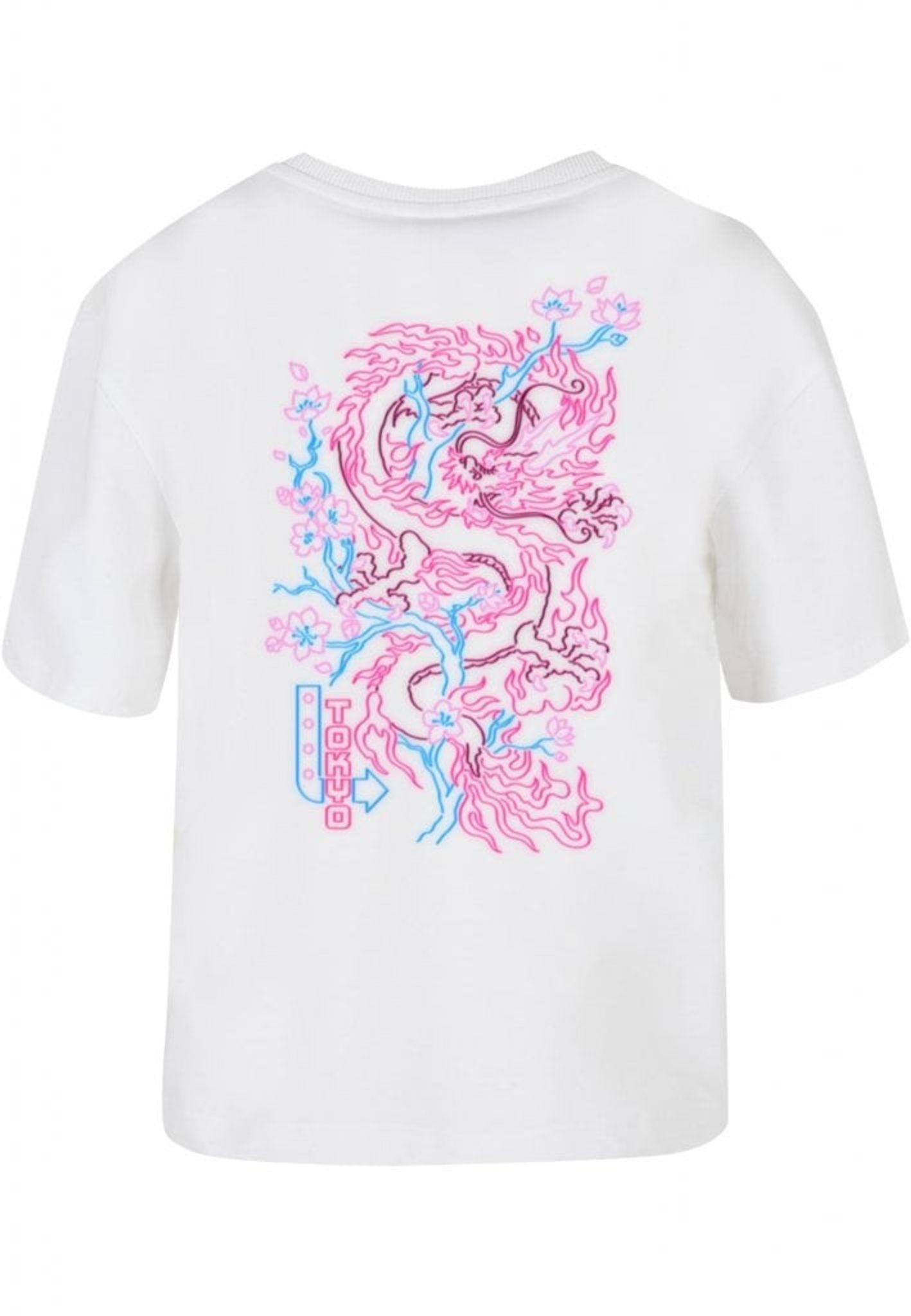 Denne T-shirt er ikke som andre almindelige skjorter. Nej, den har en stiliseret drage i neonpink og neonblå linjer, der snor sig gennem luften. En drage så yndefuld, at den får en til at føle sig som en kriger fra øst. Og for at forstærke den østasiatiske følelse er der også blomstrende kirsebærblomster, der indrammer dragen, for at vise, at selv i de mest intense kampe er der skønhed.