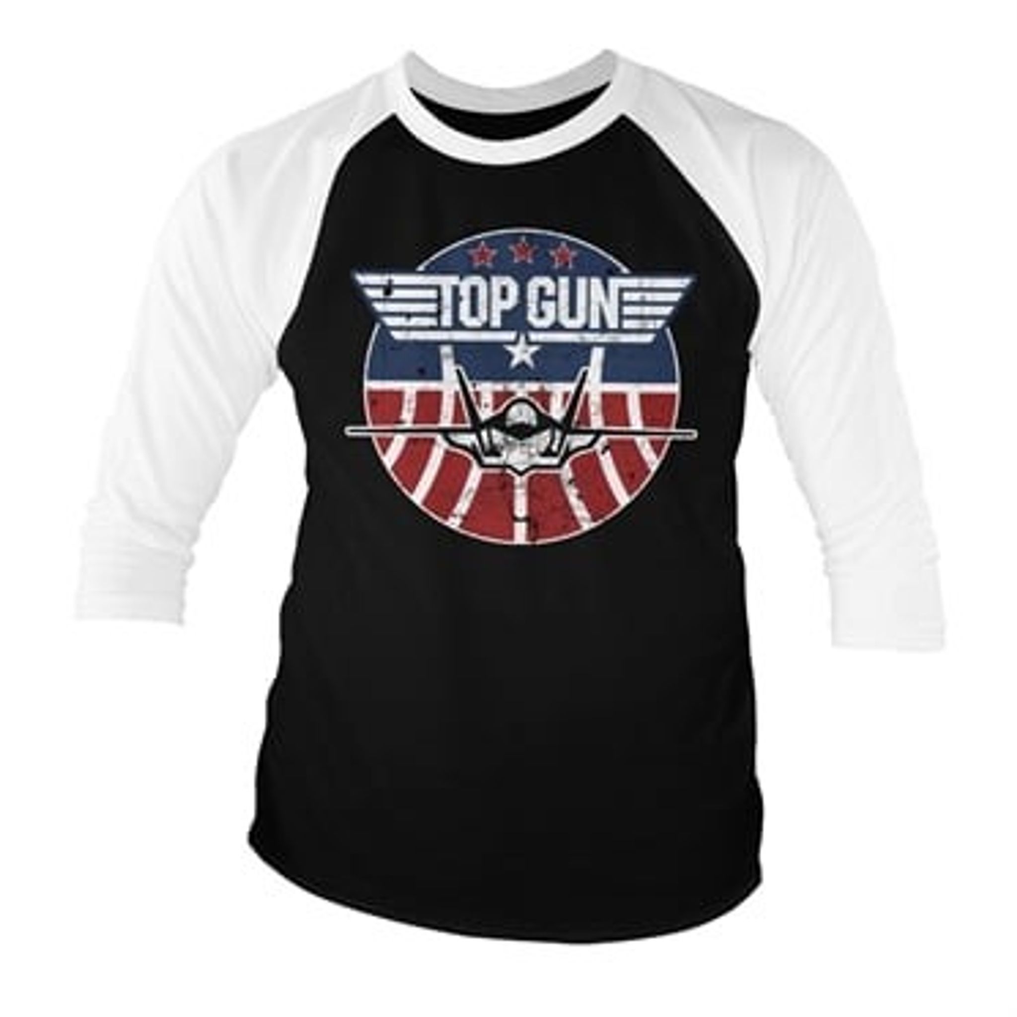80'ernes klassiske Top Gun leverer merchandise i form af en tofarvet langærmet med 3/4 lange ærmer. På brystet kan et rundt motiv ses med en F-14 Tomcat, der flyver under filmens logo.