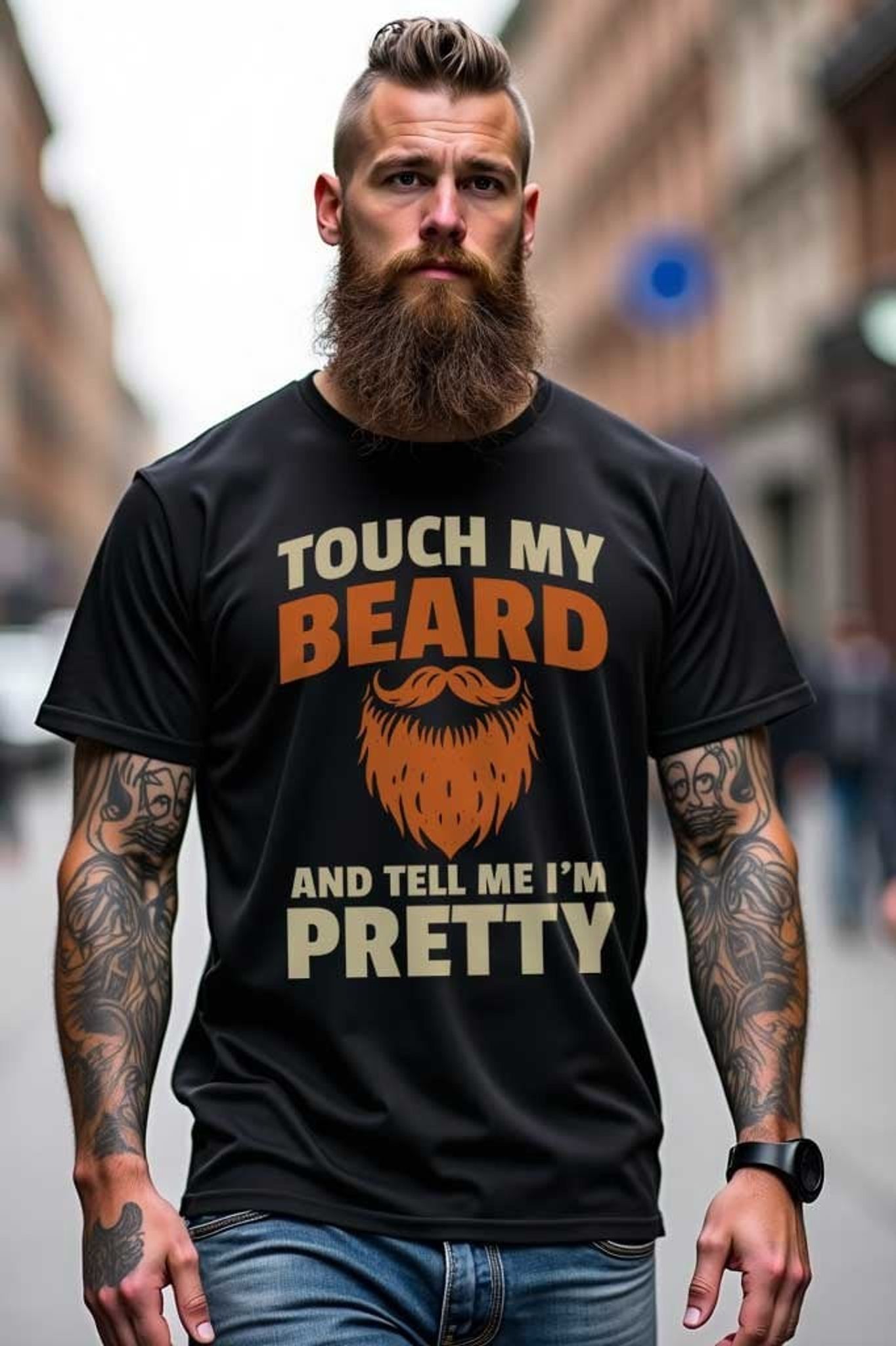 Med teksten "Touch my beard and tell me I'm pretty" med store, legende bogstaver og en stilfuld orange skægillustration i midten, er dette et design, der med garanti vil vække opmærksomhed. Den sorte baggrund fremhæver printet og skaber en cool kontrast.