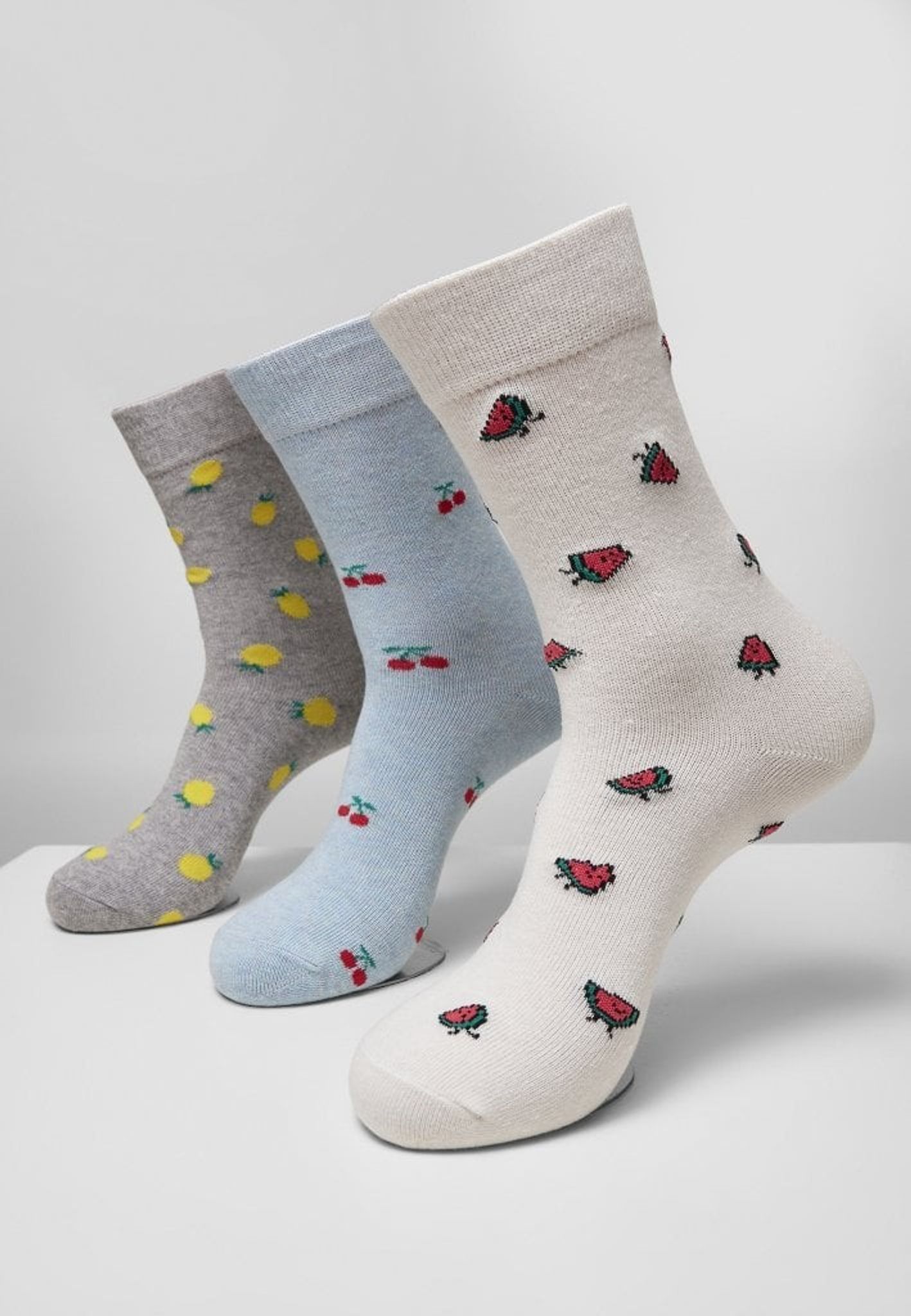 Tre par sokker med motiver af citron, melon og kirsebær.