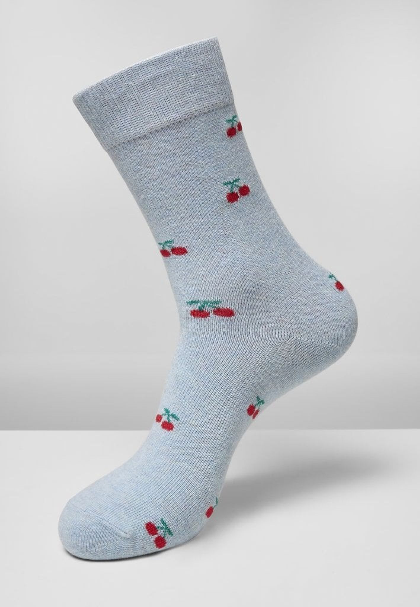 - Mønster: Et par sokker er grå med gule citroner, en sokker er blå med røde kirsebær og et par er cremet hvid med rød og grøn melon.