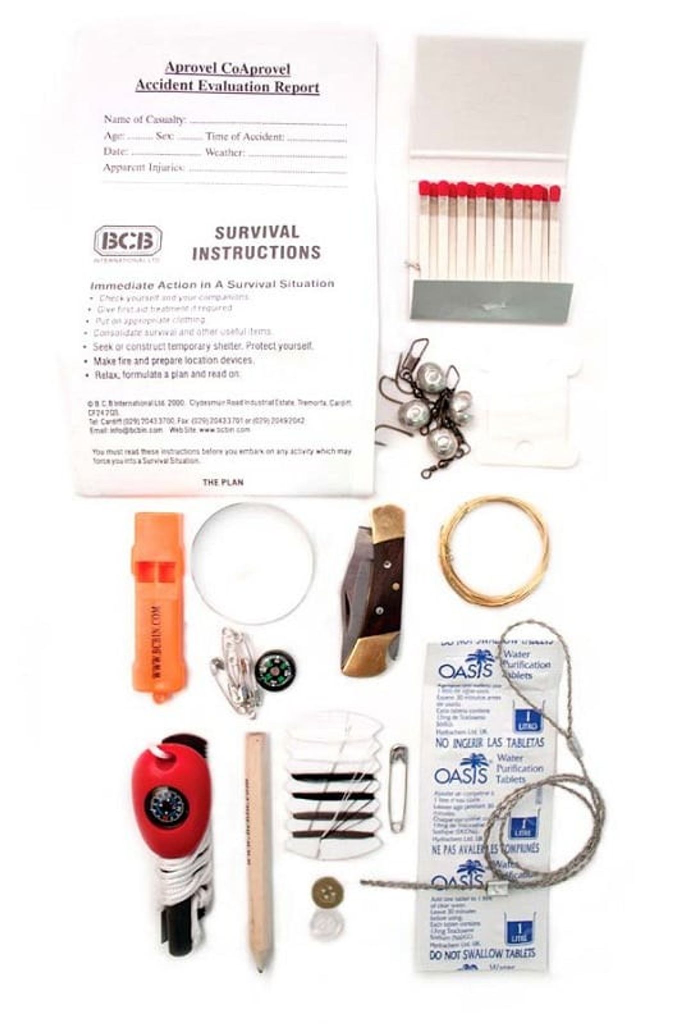 Indholdet i dåserne inkluderer en stærk selvlåsende lommekniv, der giver sikker og effektiv brug. Vandrensningstabletter er inkluderet for at sikre, at drikkevand er sikkert at indtage. For at kunne starte et bål er der en ildkugleflint og lighter.