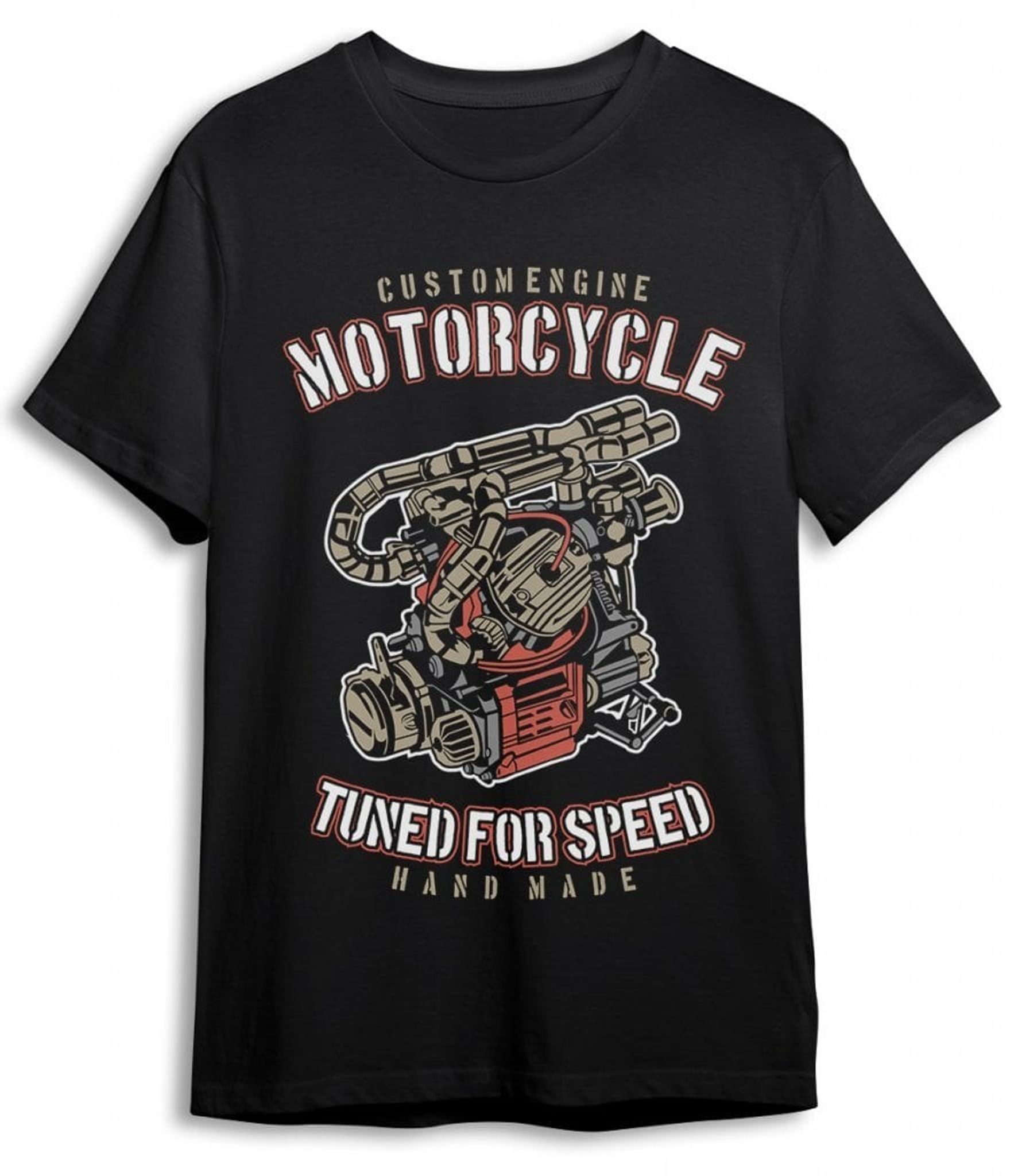 Så hvis du vil udtrykke din kærlighed til hurtige biler og højtydende motorer, er denne T-shirt med et trykt billede af en brølende bilmotor og teksten "Tuned For Speed" et godt valg for dig.