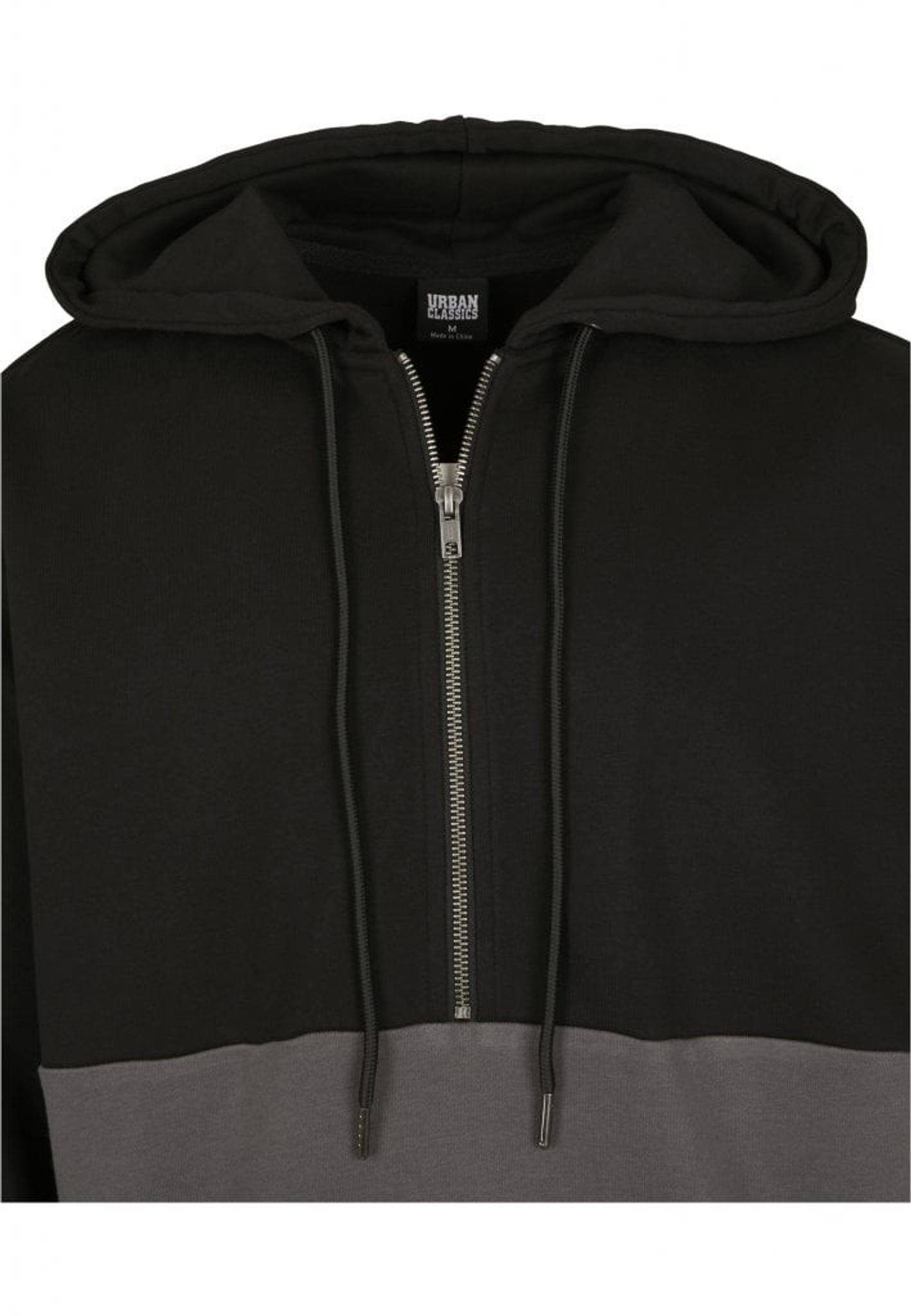 En hættetrøje med sort farve øverst og grå i bunden.