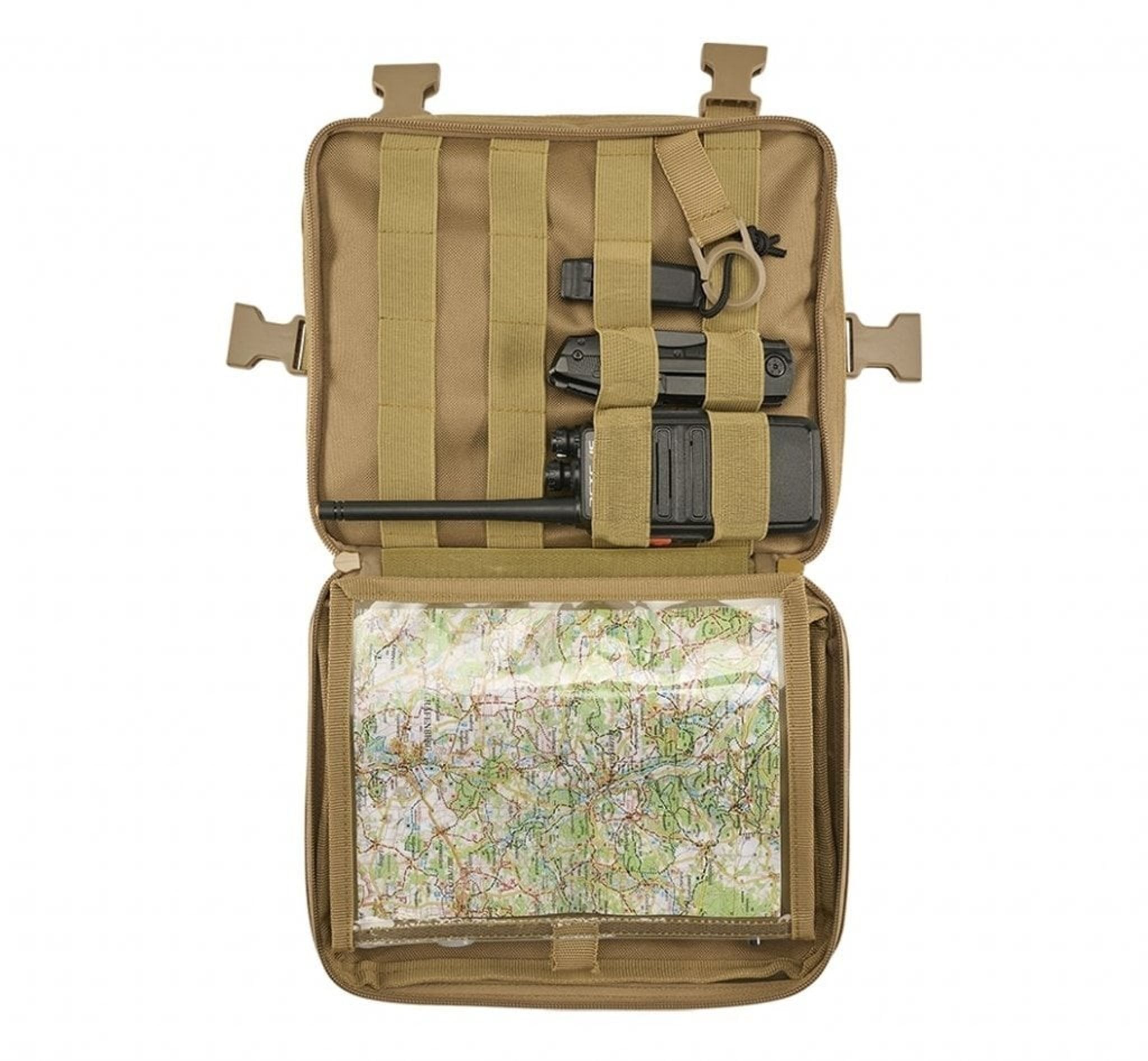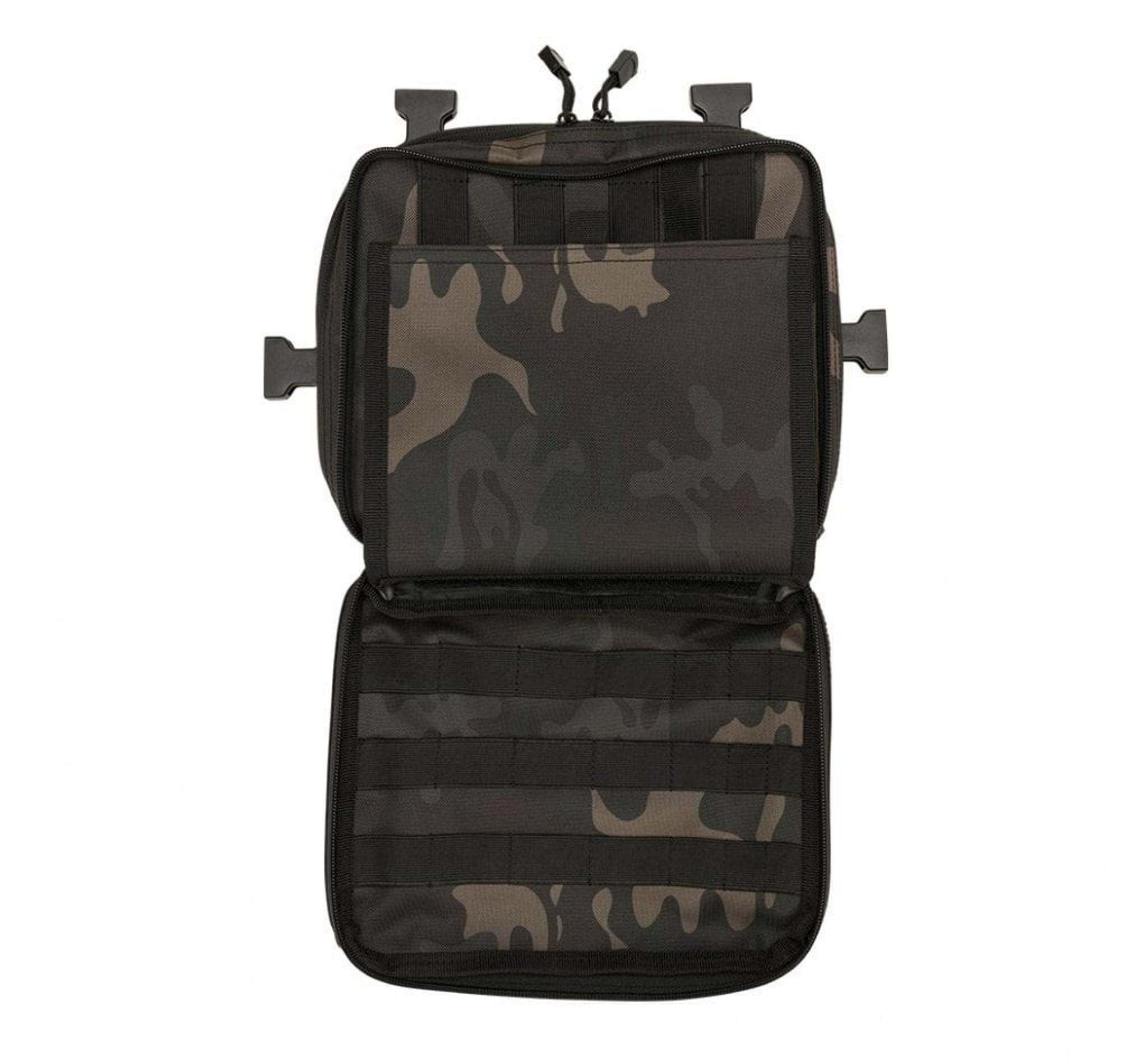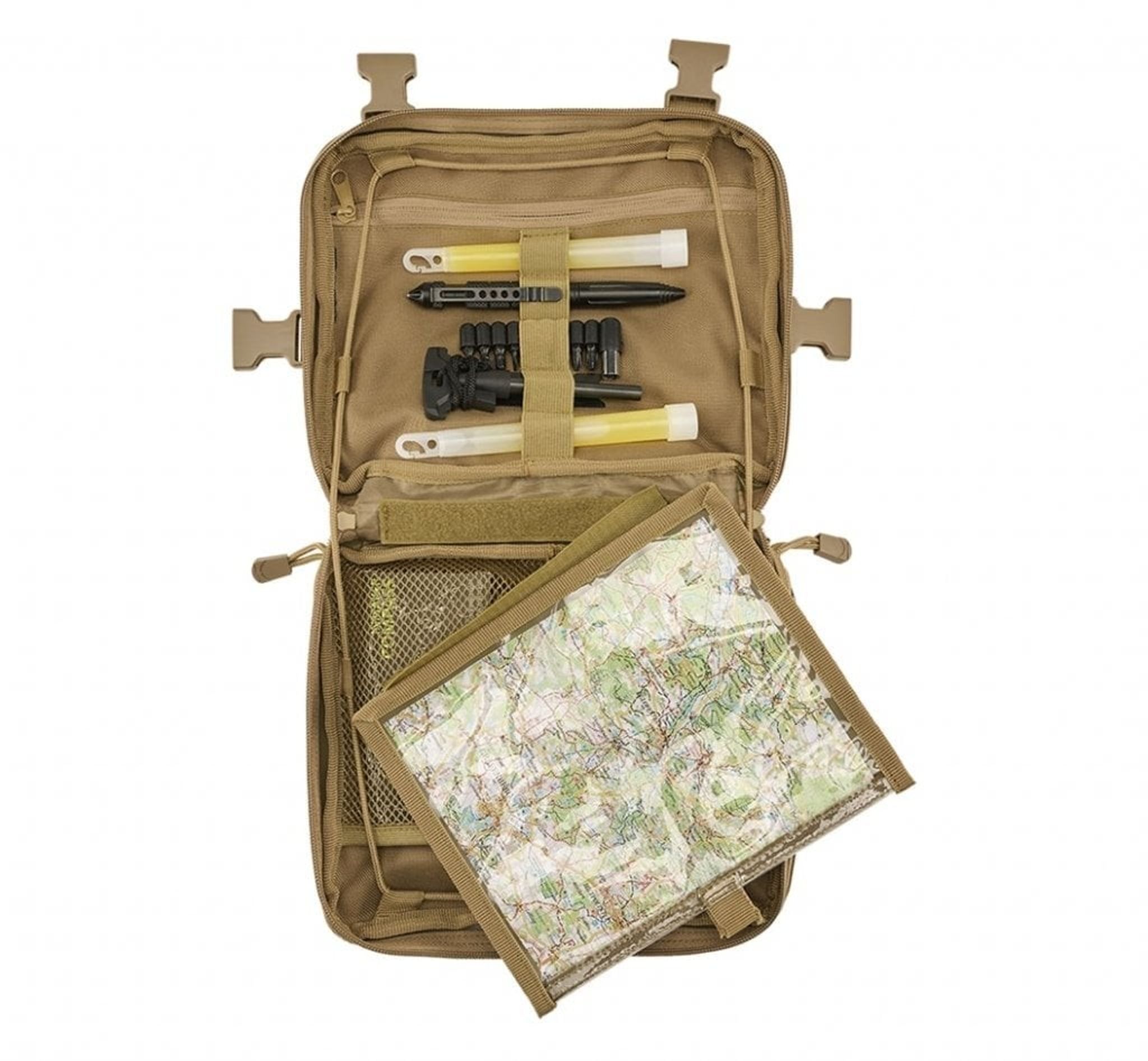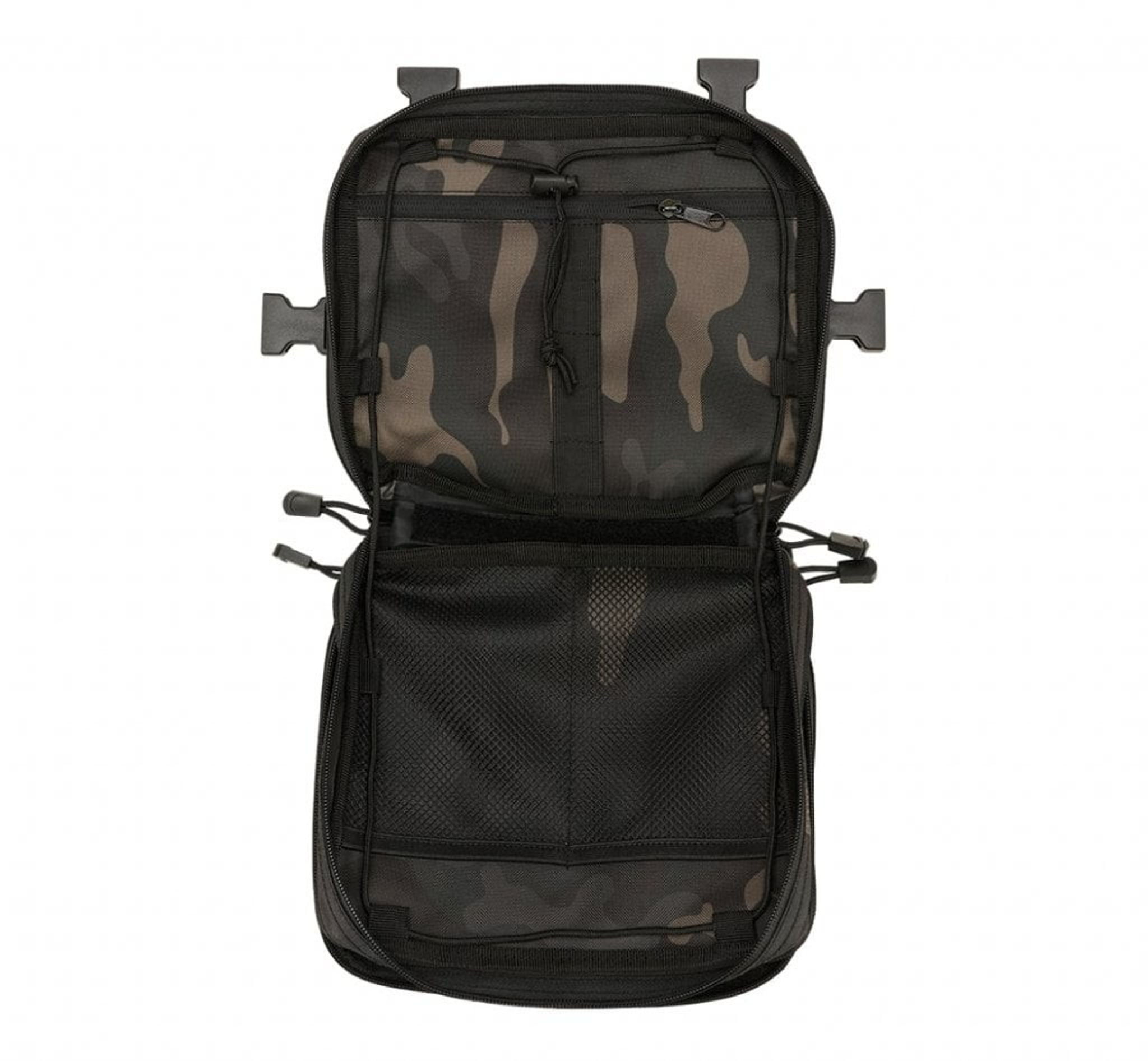 Inde i tasken er der et rum med lynlås og MOLLE løkker med velcro. Tasken har desuden 2 netlommer og 2 D-ringe/nøglering.