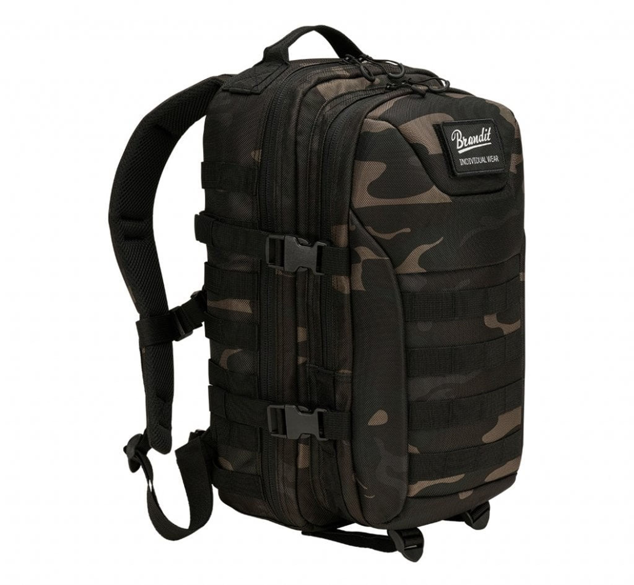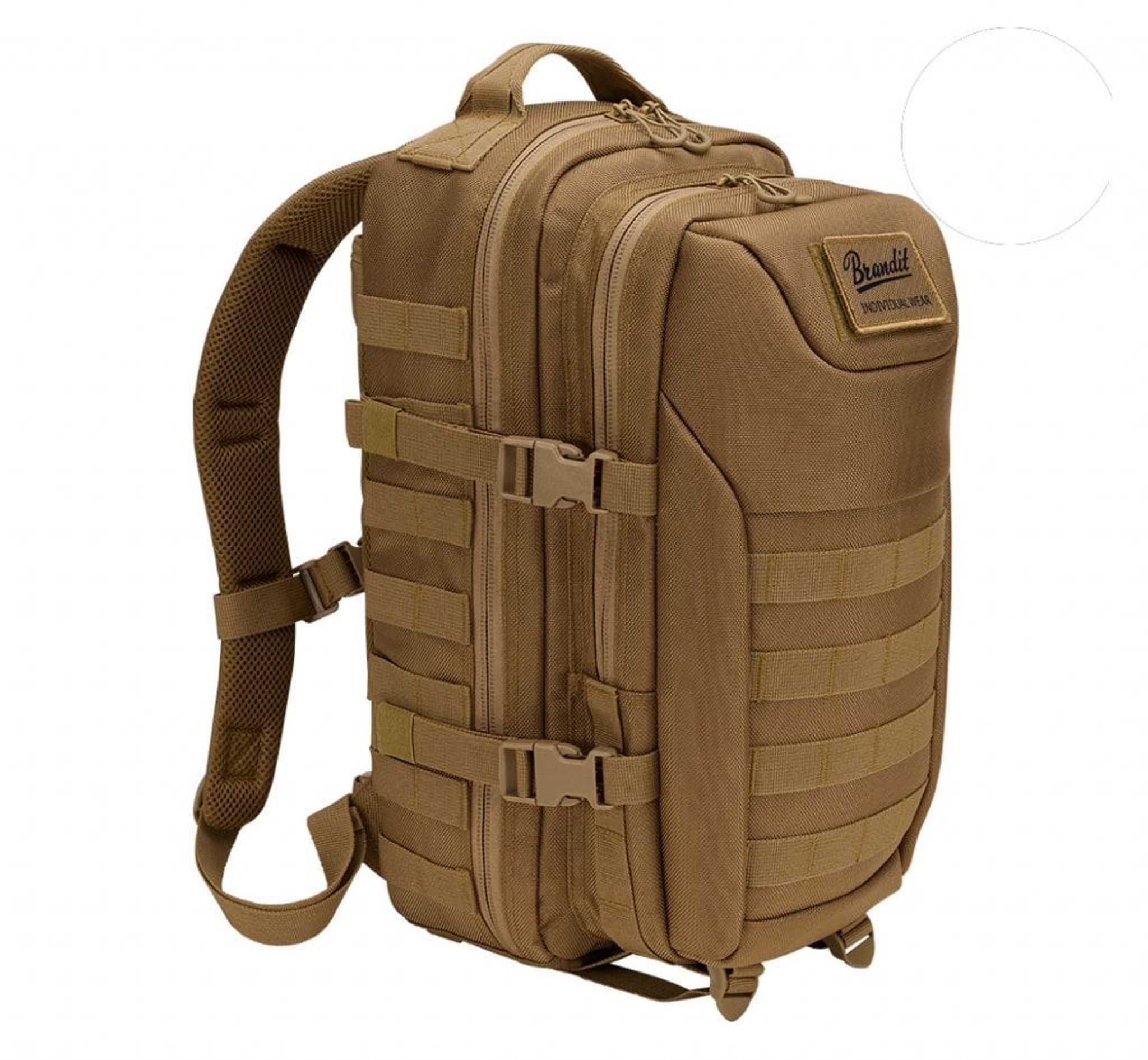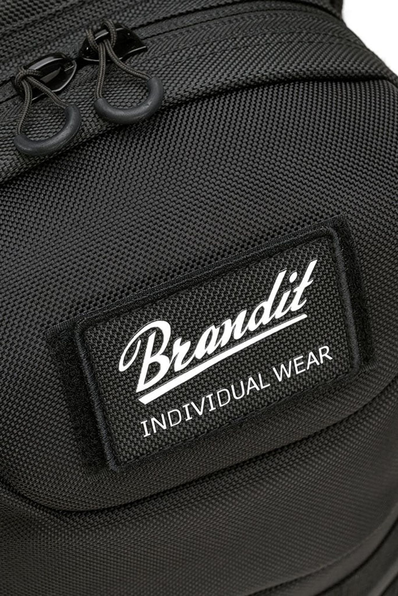 Ydersiden har flere praktiske funktioner såsom robust vendbar lynlås, C-ring lynlåse, MOLLE løkker, Brandit patch, patch krog-og-løkke overflade, sidekompressionsstropper, justerbar brystrem, polstrede skulderstropper, justerbar hoftebælte.