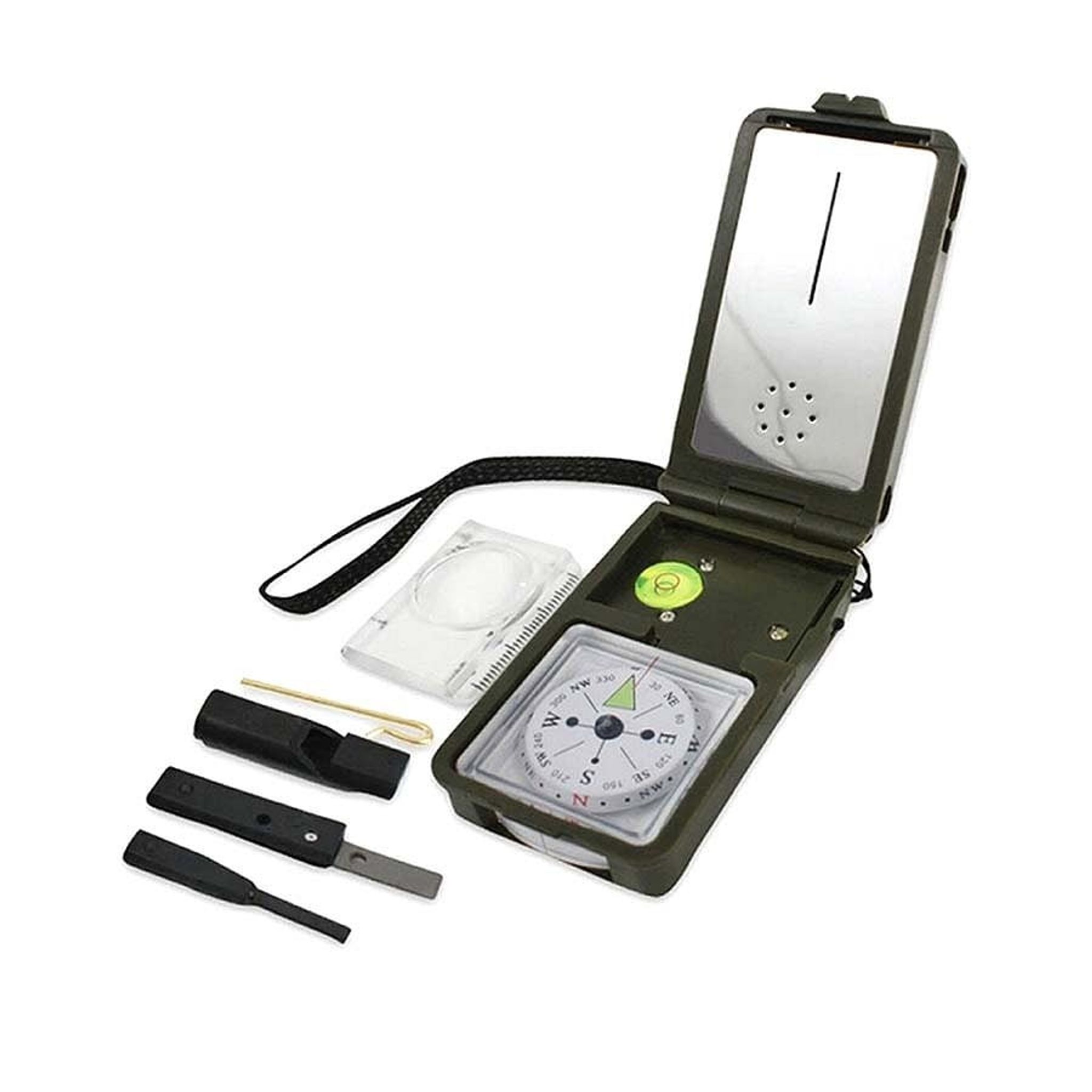 For at sikre, at dine projekter er i vater, er der indbygget et vaterpas. Derudover er et kompas integreret for at hjælpe med navigation. En fløjte kan bruges til at signalere eller tilkalde hjælp, og der medfølger en flint til at starte en ild.