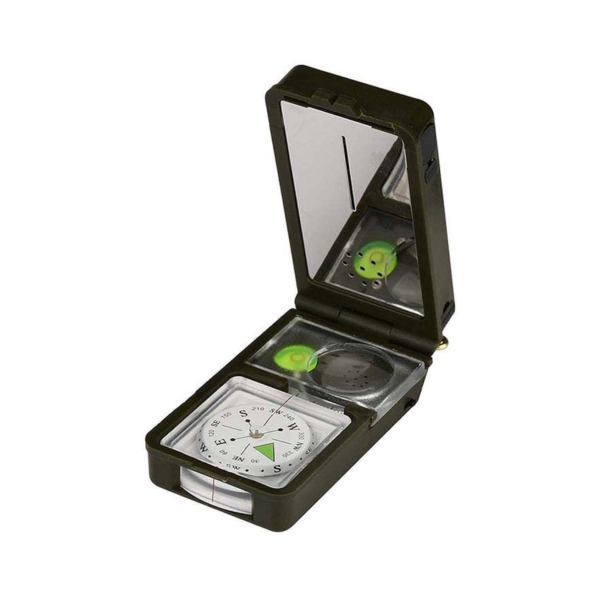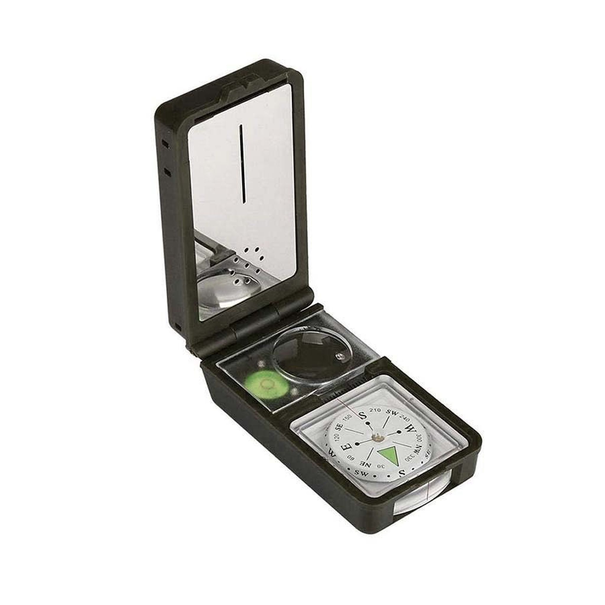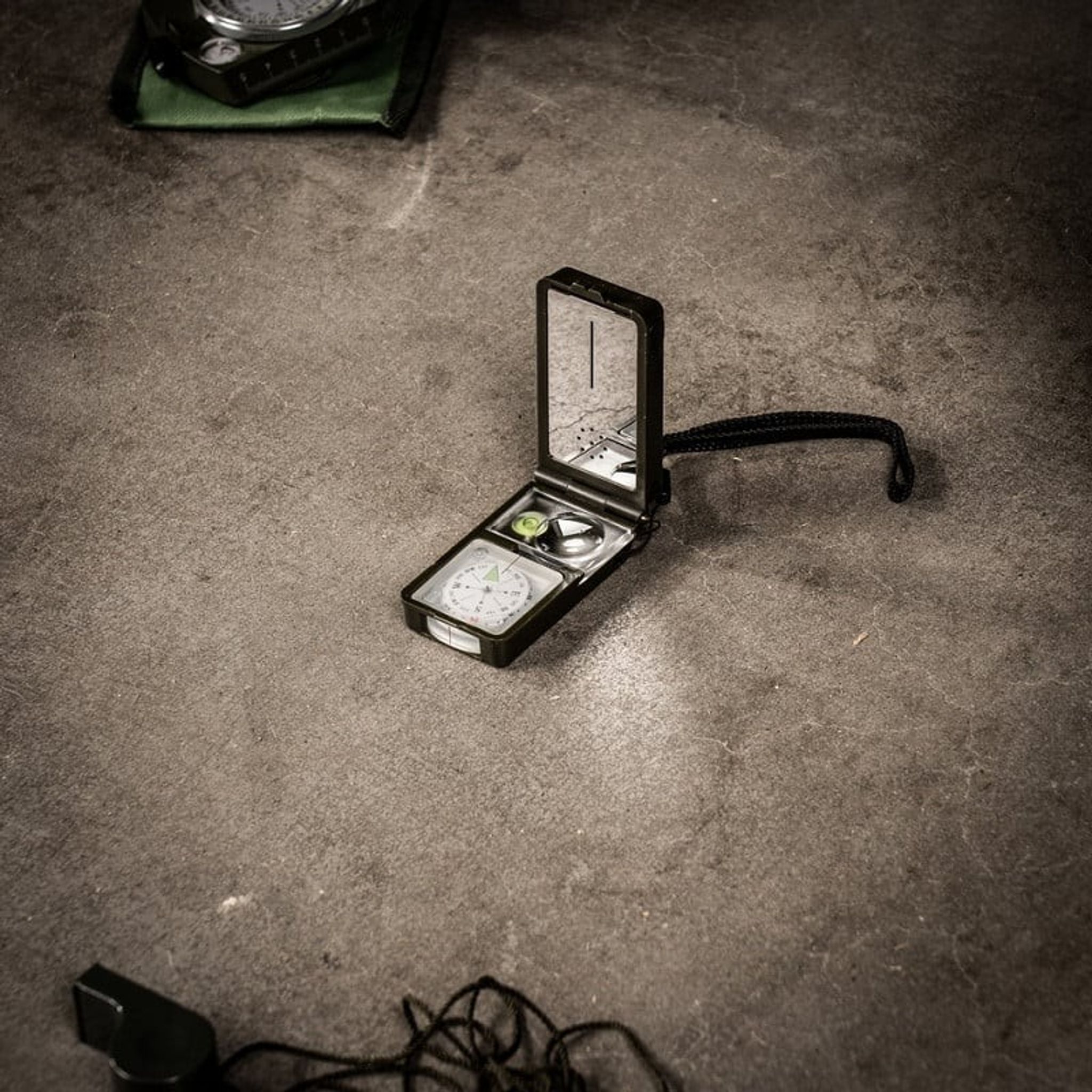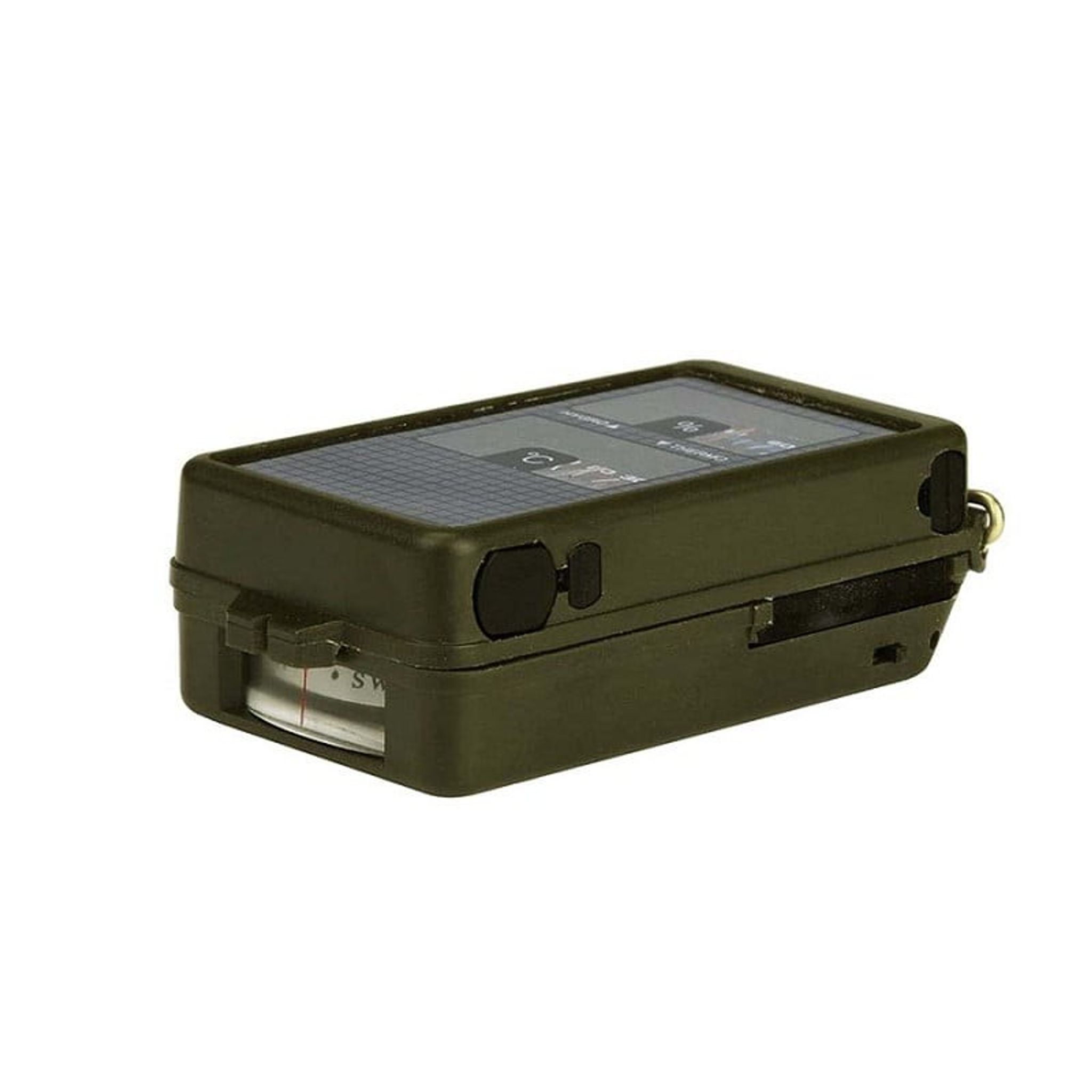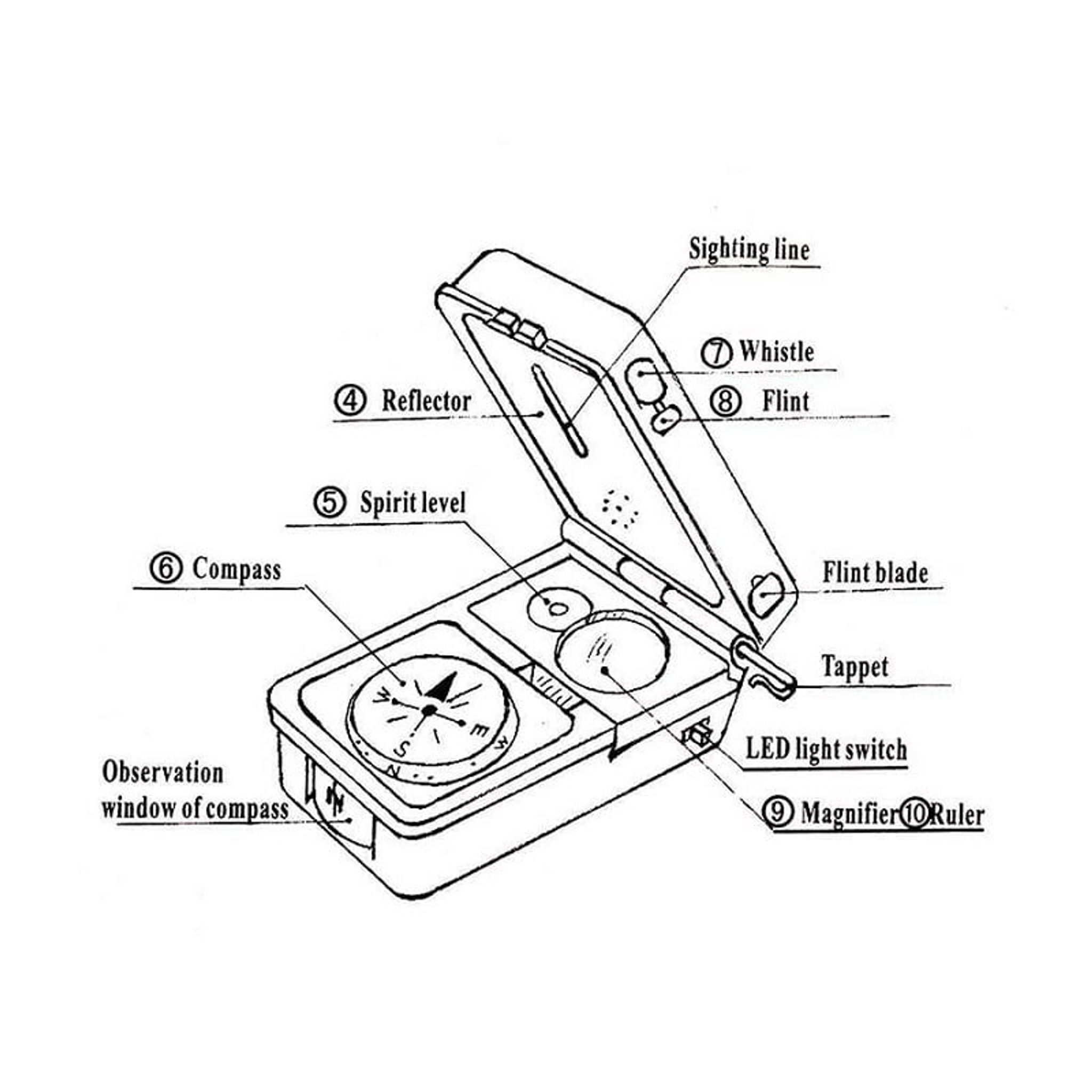 - Funktioner: termometer, hygrometer, LED-lampe, reflektor, vaterpas, kompas, fløjte, flint, forstørrelsesglas, lineal