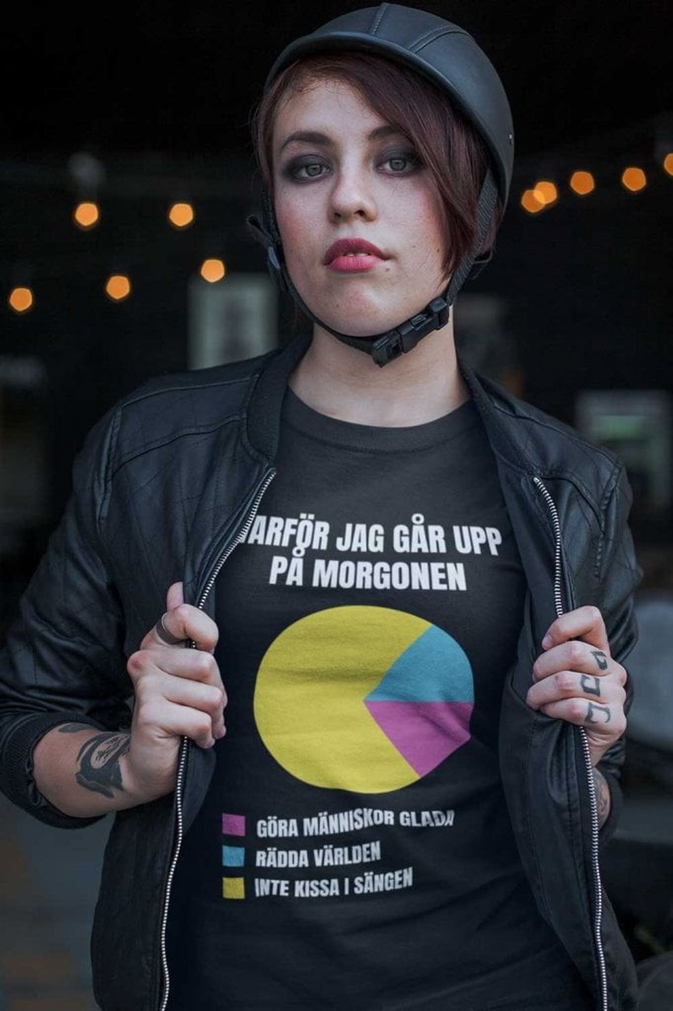 Why I Get Up T-shirt er en humoristisk t-shirt, der fanger de vigtige grunde til at stå ud af sengen hver morgen. Med et sjovt diagramtryk, der deler årsagerne mellem "Gør folk glade", "Save the World" og "Don't Wet the Bed" er denne t-shirt perfekt til dem, der ønsker at sprede lidt latter og glade vibes omkring dig . Diagrammets legende farver står i skarp kontrast til den sorte baggrund, hvilket gør, at designet virkelig skiller sig ud.
