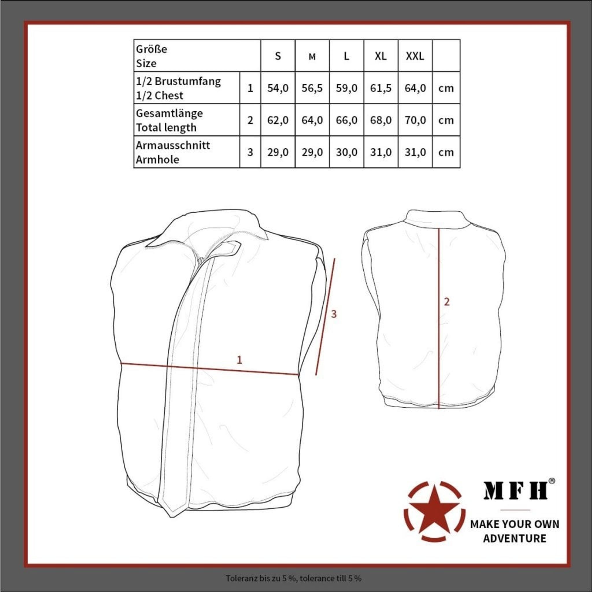 Vesten har 9 lommer på fronten, der lukkes med en lynlås eller klap og borrelås.