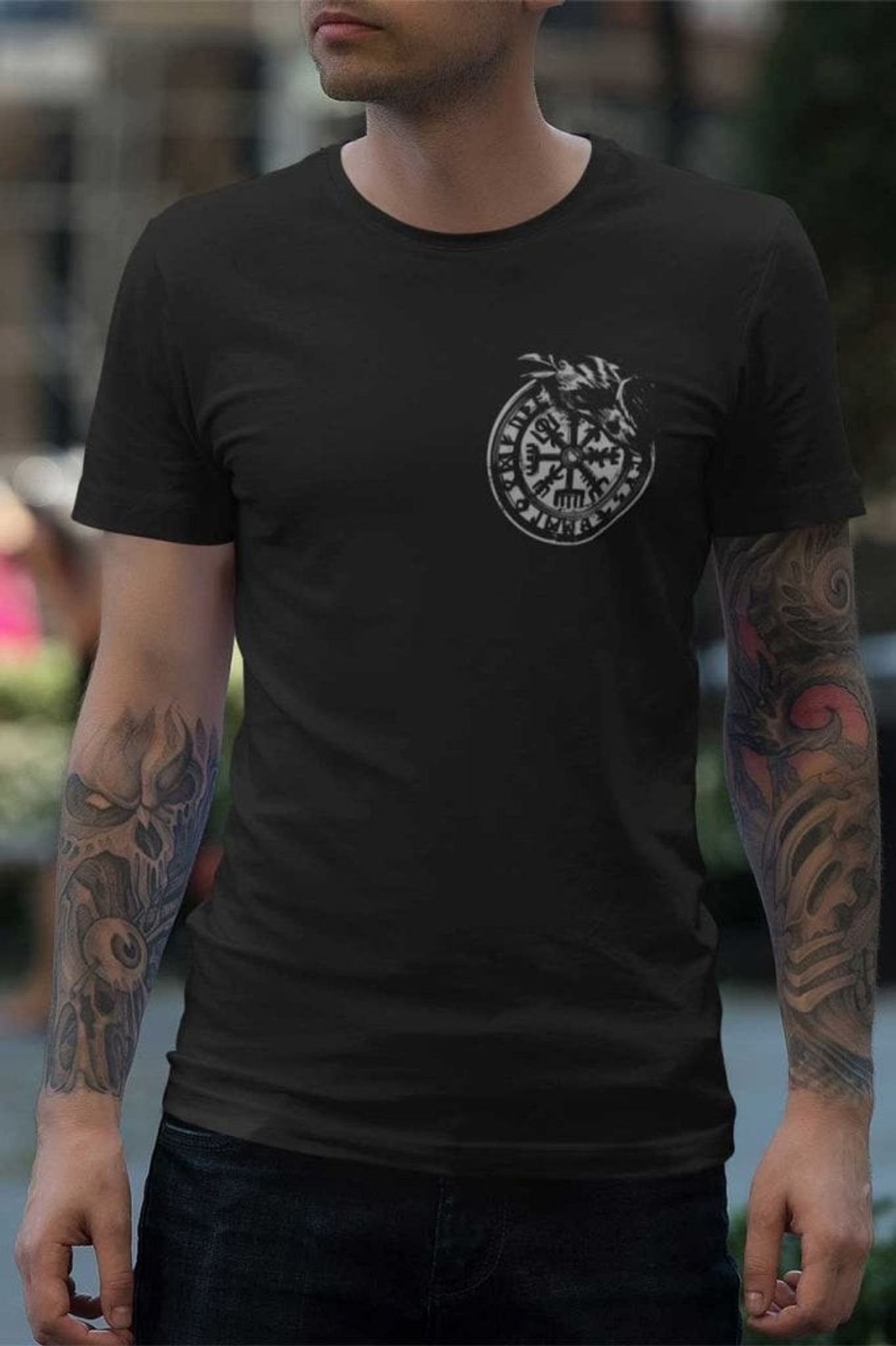 Sort T-shirt med det gamle oldnordiske symbol Vegvisir sammen med en ensom ravn. Vejvisir har form som et kompas og var et magisk ladet symbol, der siges at være i stand til at hjælpe søfarende gennem vanskelige farvande.