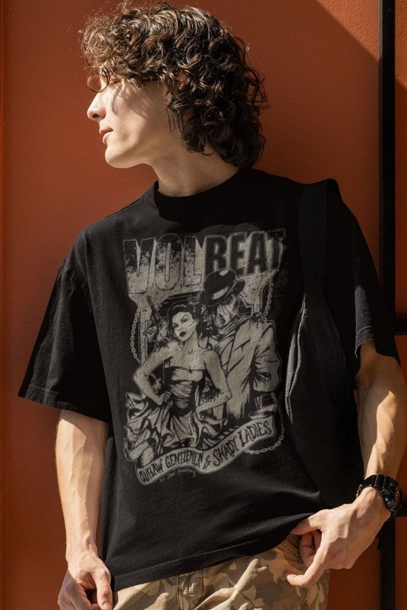 Denne T-shirt er ikke en hvilken som helst almindelig skjorte - den er en hyldest til Volbeats episke album "Outlaw Gentlemen & Shady Ladies". Med motivet af to karakterer, der ser ud som om de er trådt direkte ud af en westernfilm, er denne skjorte fuld af rebelsk elegance og rå karisma. En mystisk herre og en elegant dame overtager scenen, klædt i en stil, der ville få Clint Eastwood til at ligne en novice.