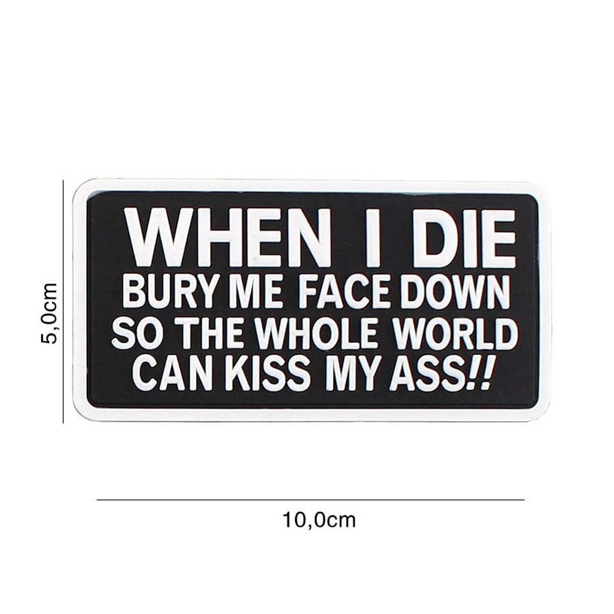 Føj en stor dosis sarkasme til dit udstyr med "When I Die - PVC Patch". Dette plaster er ikke kun et humoristisk tilbehør, men en måde at vise din unikke personlighed og syn på livet. Med teksten "NÅR JEG DØR BURY ME FACE DOWN SO THE WHOLE WORLD CAN KISS MY ASS!!" det garanterer opmærksomhed og latter. Dette plaster er lavet af slidstærkt PVC-gummi og er lige så robust, som dets budskab er fed.