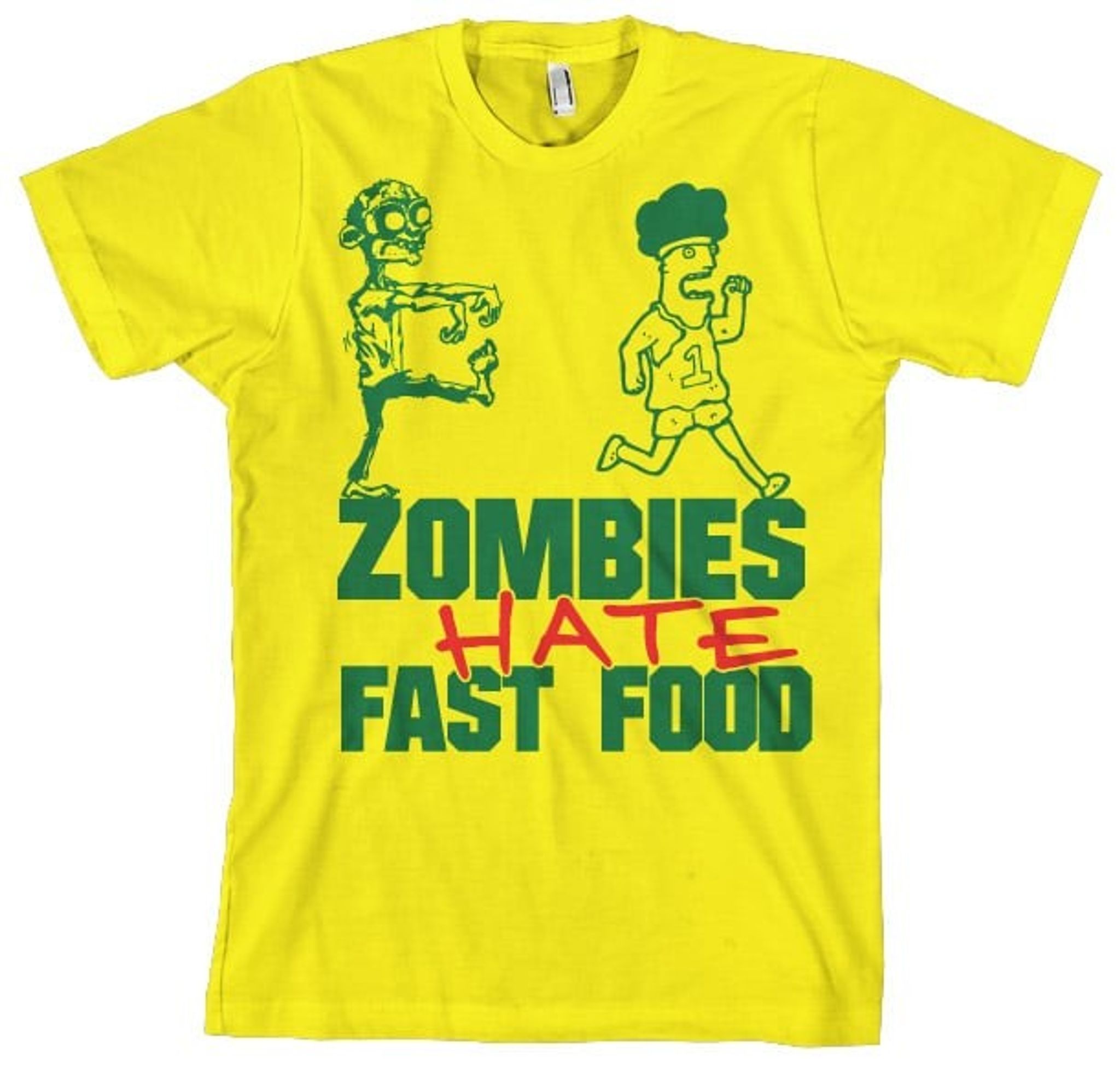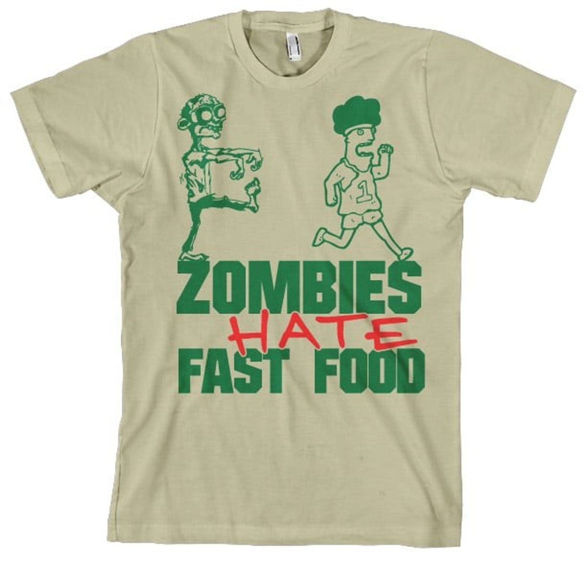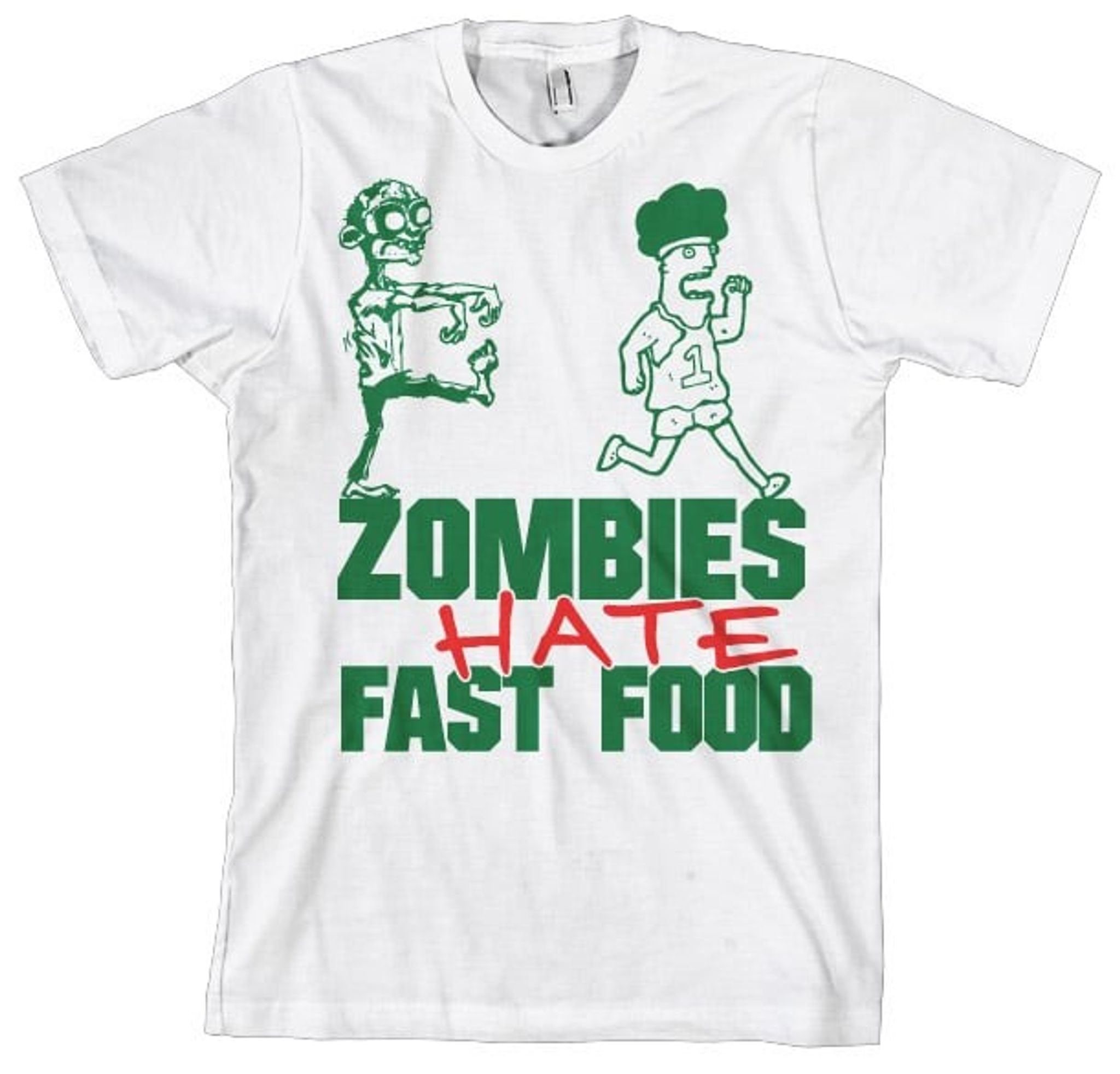 Med presset "zombier hader fastfood" viser du, at du ikke har til hensigt at være let at ændre for de udøde. Du er klar til at kæmpe for din overlevelse, og du spiser ikke fastfood - det er intet andet end en hurtig død!